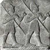 İki atın çektigi iki tekerlekli bir savaş arabası ile atın altında yere düşmüş bir düşman askeri gösterilmiştir.Bu sahne Geç Hitit döneminde çok kullanılmış ve birçok yerde tekrar edilmiştir. |