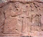 İki atın çektigi iki tekerlekli bir savaş arabası ile atın altında yere düşmüş bir düşman askeri gösterilmiştir.Bu sahne Geç Hitit döneminde çok kullanılmış ve birçok yerde tekrar edilmiştir. |